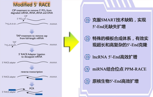 (1) 修飾的5’-RACE技術(shù):在經(jīng)典5’-RACE基礎(chǔ)上,進(jìn)行了諸多改進(jìn),如加入增強劑,選取耐高溫、高效逆轉(zhuǎn)錄酶,以及縮短每步RNA沉淀過程,減少RNA降解等方式,有效實現(xiàn)了超長、特殊結(jié)構(gòu)5’-RACE片段的獲?。?/span>